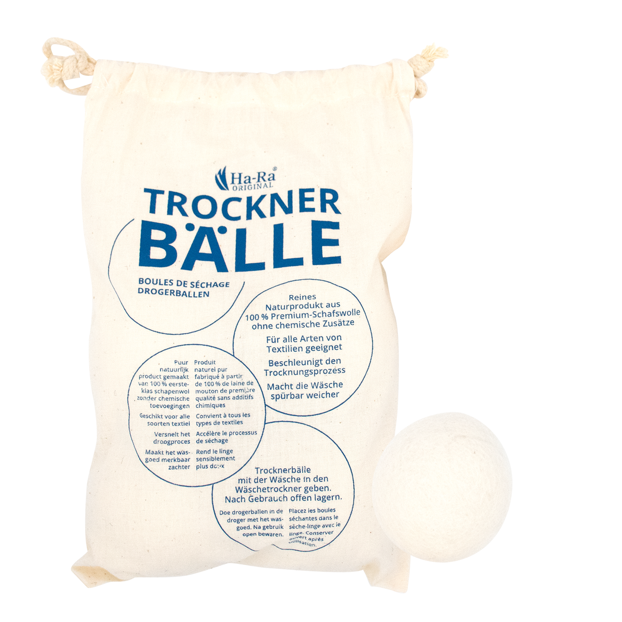 Die Ha-Ra Trocknerbälle aus 100 % Premium-Schafswolle für ein effizienteres Trocknen.